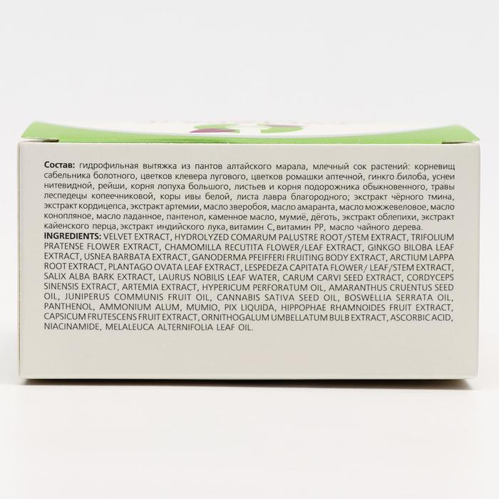 Состав: гидрофильная вытяжка из пантов алтайского марала, млечный сок растений: корневищ сабельника болотного, цветков клевера лугового, цветков ромашки аптечной, гинкго билоба, уснеи нитевидной, рейши, корня лопуха большого, листьев и корня подорожника обыкновенного, травы леспедецы копеечниковой, коры ивы белой, листа лавра благородного; экстракт чёрного тмина, экстракт кордицепса, экстракт артемии, масло зверобоя, масло амаранта, масло можжевеловое, масло конопляное, масло ладанное, пантенол, каменное масло, мумиё, дёготь, экстракт облепихи, экстракт кенийского перца, экстракт индийского лука, витамин С, витамин РР, масло чайного дерева.