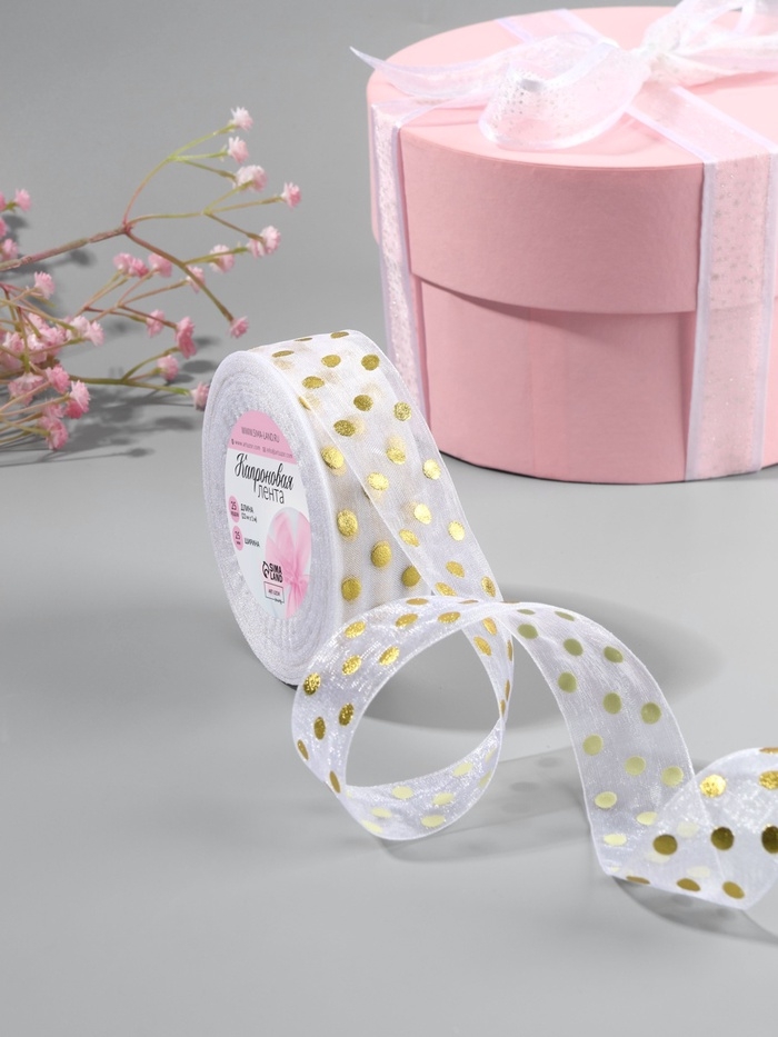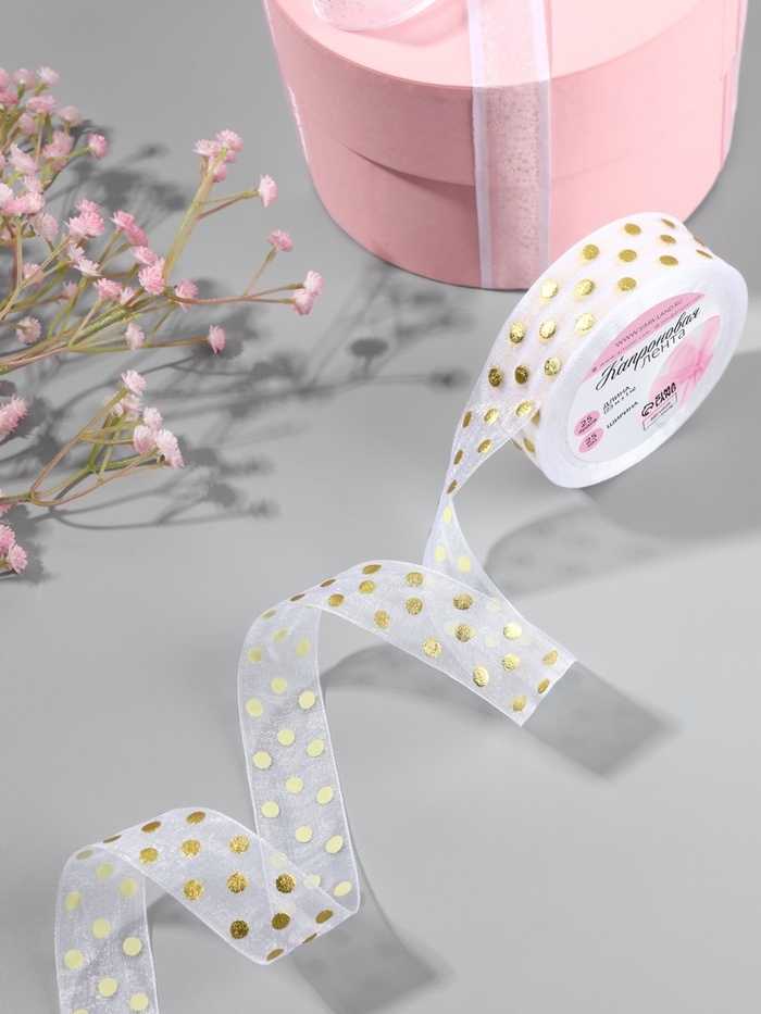 Лента капроновая с тиснением «Горох», 25 мм, 22 ± 1 м, цвет белый/золотой