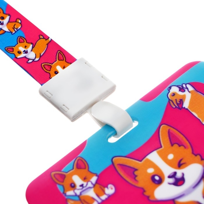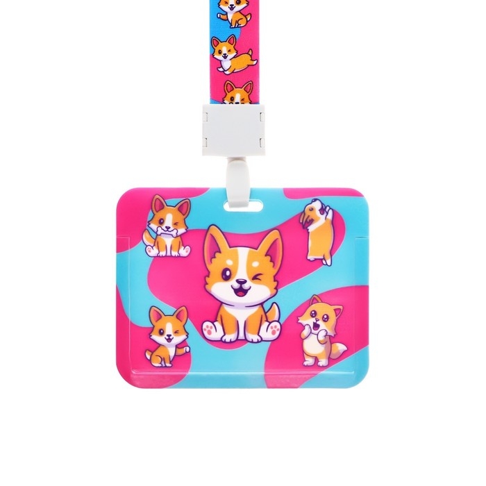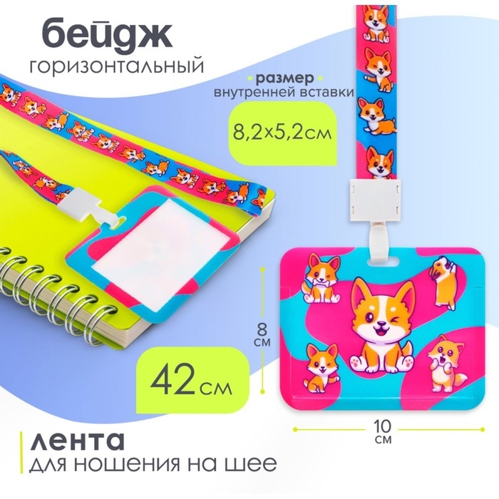 Бейдж горизонтальный, внешний 100 х 80мм, внутренний 52 х 82мм, лента 42 см, Корги