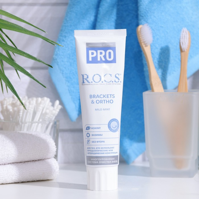 Зубная паста R.O.C.S.® PRO Brackets & Ortho – это модифицированная формула зубных паст R.O.C.S.® PRO «Деликатное отбеливание» со специальными гранулами, усиливающими очищающие свойства.