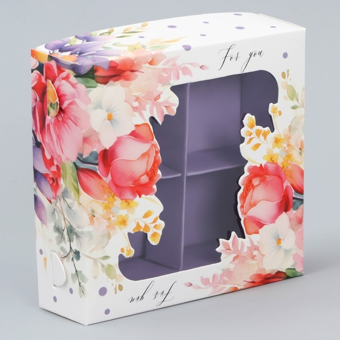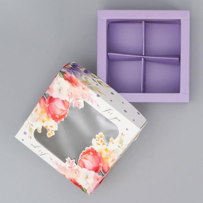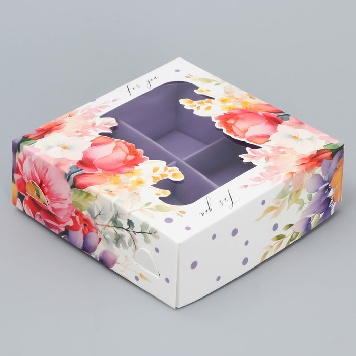 Коробка для конфет, кондитерская упаковка, 4 ячейки, «Цветы», 10.5 х 10.5 х 3.5 см