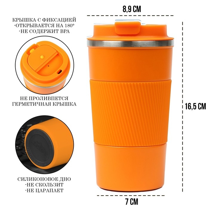 Термокружка выполнена из 304 нержавеющей стали, сконструирована по вакуумной технологии, с двойной стенкой, следовательно, долго держит тепло и не проливается. Снабжена откидывающейся крышкой на 180°, изготовленная из экологичного пищевого пластика, имеется фиксатор, возможность с легкостью использовать термокружку одной рукой. На дне, термокружка имеет специальную прорезиненную основу, предотвращающую царапины на поверхностях.