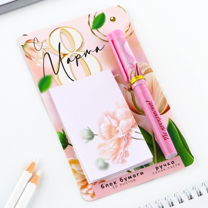 Набор ручка шариковая и блок бумаги 30 л «С 8 марта»