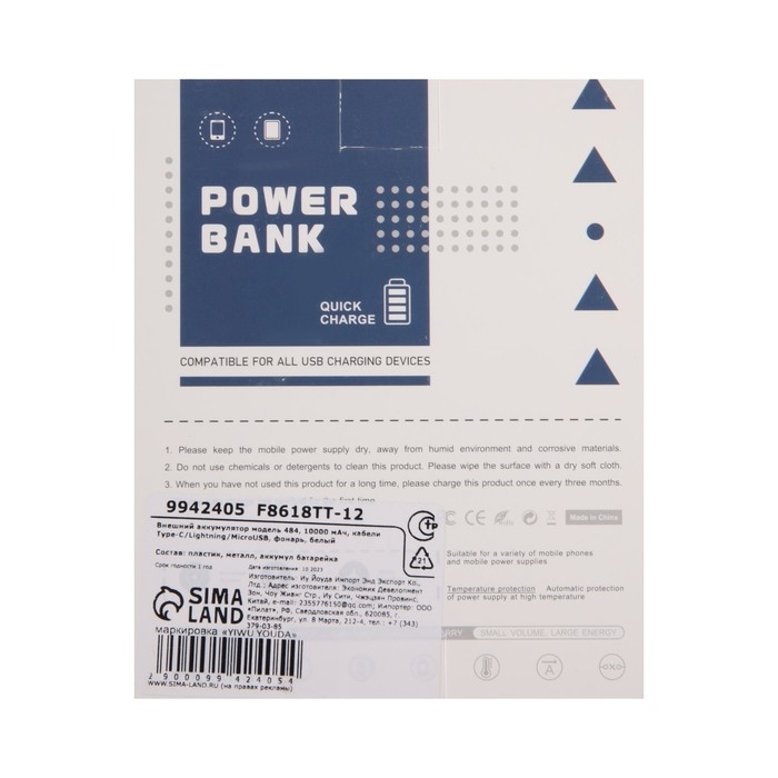 Внешний аккумулятор 484, 10000 мАч, кабели Type-C/Lightning/MicroUSB, фонарь, белый