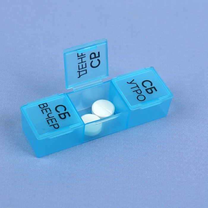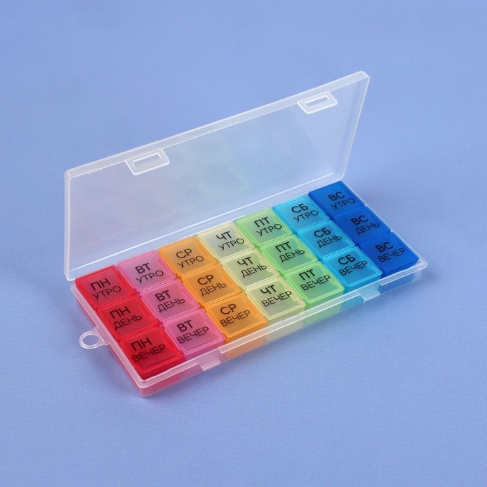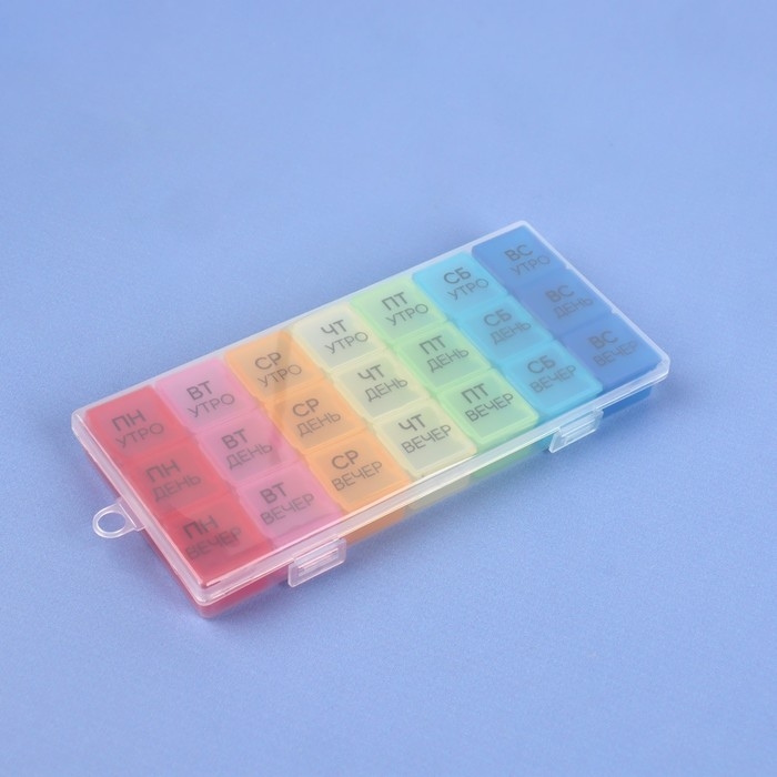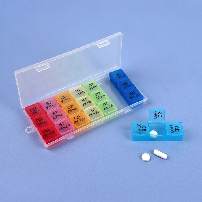Теперь Вы не забудете принять витамины или таблетки в течение дня: удобная и функциональная таблетница поможет распределить приём нужных препаратов по дням недели и вовремя вспомнить о них.