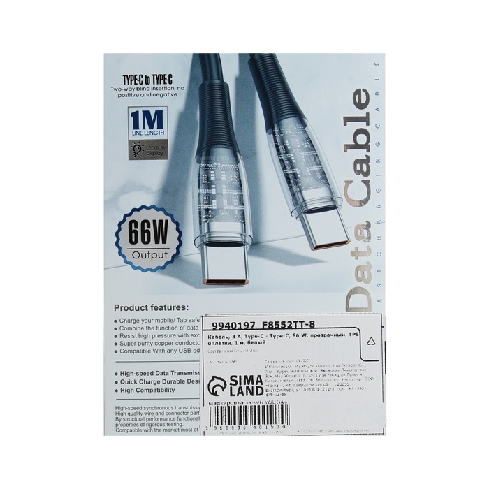 Кабель, 3 А, Type-C - Type-C, 66 W, прозрачный, TPE оплётка, 1 м, белый