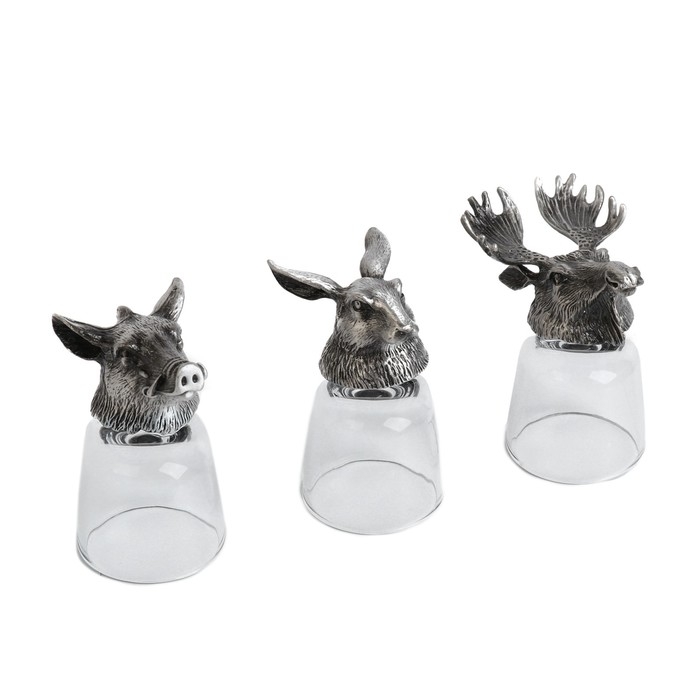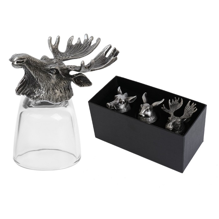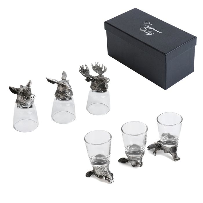 Набор стопок-перевертышей высокого качества с головами животных — оригинальный подарок для охотника, а также будет незаменим на большом дружеском застолье или на охотничьем привале.
