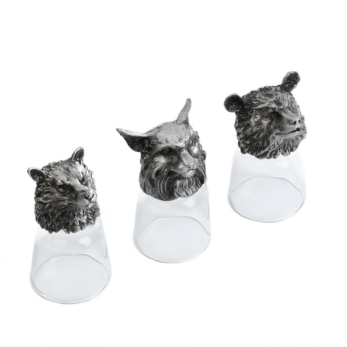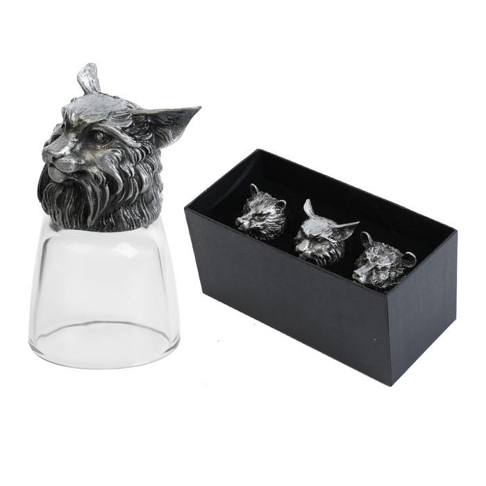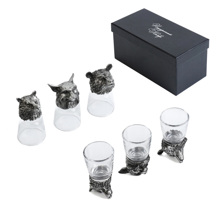 Набор стопок-перевертышей высокого качества с головами животных — оригинальный подарок для охотника, а также будет незаменим на большом дружеском застолье или на охотничьем привале.