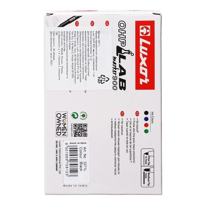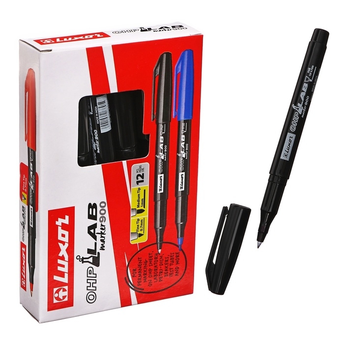 Перманентный маркер лабораторный Luxor "OHP 910" - ультра тонкая маркировка на всех типах гладких поверхностей: стекло, металл, дерево, резина, пленка, картон. Рекомендуем использовать для для тонкой и точной маркировки на гладких и прозрачных поверхностях в лабораториях и медицинских учреждениях. Подходит для маркировки рентгеновких снимков, ацетатных пленок, Чашек Петри и другой лабораторной посуды. Ультратонкий пишущий узел позволяет наносить четкие и тонкие линии 0,7 мм