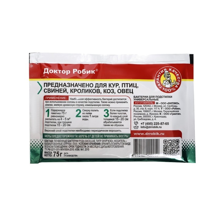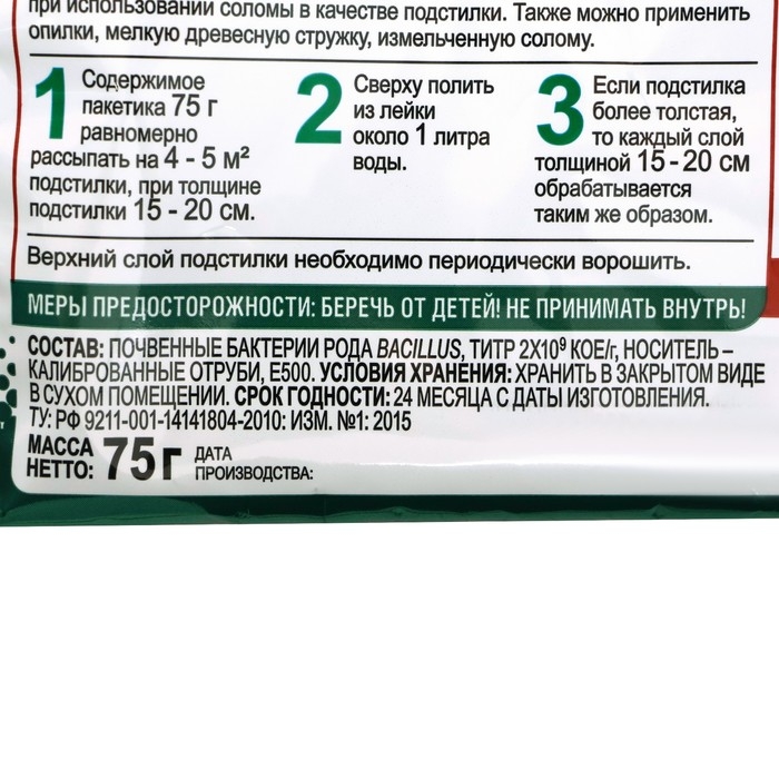 Бактерии для подстилки Доктор Робик применяется для обогащения подстилки "для животных и птиц" почвенными бактериями рода Bacillus. Бактерии для подстилки предназначены для свиней, кроликов, кур, птиц, коз, овец и КРС.Повышают температуру подстилки в коровниках, свинарниках и курятниках.Снижают уровень аммиака в воздухе.Эффективно перерабатывают помет и солому прямо в подстилке.Отработанная подстилка может использоваться для приготовления качественного компоста. Уменьшают периодичность уборки помещений.Безопасно для животных, человека и окружающей среды.1 пакетик (75 г) рассчитан на 4-5 м2 одного слоя (толщина 15-20 см) подстилки. ПРИМЕНЕНИЕ: Эффективная подстилка состоит из опилок или измельченной соломы, которые укладываются в несколько слоёв, каждый по 15-20 см. Укладывается первый слой, посыпается бактериями, сверху полить из лейки около 1 л воды, последующие слои обрабатываются таким же образом. Затем запускаются птицы или животные. Для птиц рекомендовано 2-3 слоя, для животных - 3-4 слоя. Верхний слой подстилки рыхлится 1 раз в неделю или чаще. Со временем она утрамбовывается и тогда следует положить новый слой. Такая подстилка может служить до 2-х лет. Далее на её основе можно получить органическое удобрение. СОСТАВ: почвенные бактерии рода Bacillus, титр 2 х10 в 9 степени КОЕ/г. носитель - калиброванные отруби, Е500 (сода). СРОК ГОДНОСТИ: 24 месяца с даты изготовления. Условия хранения: хранить в закрытом виде в сухом помещении. Меры предосторожности: Беречь от детей. Не принимать внутрь.
