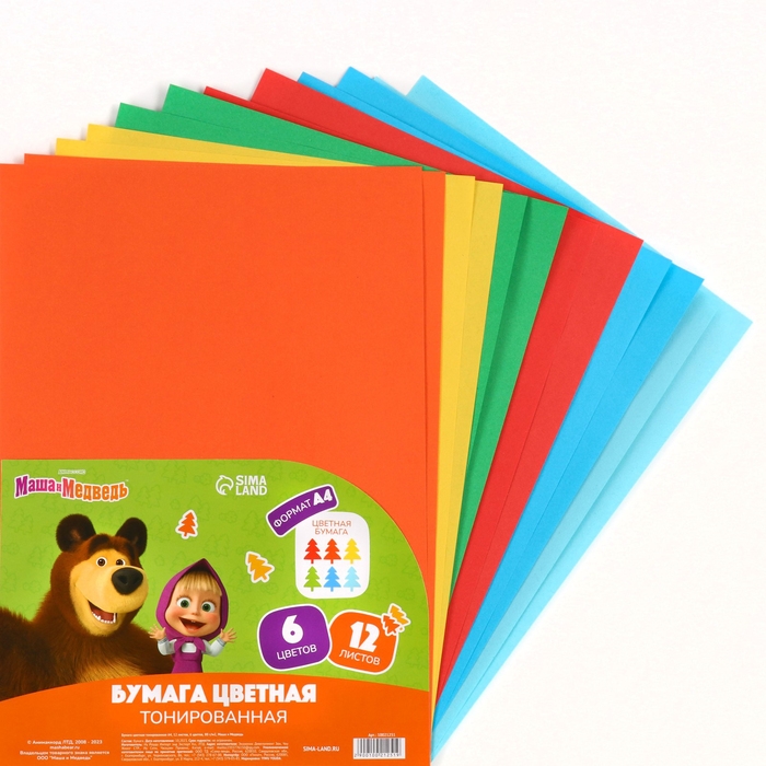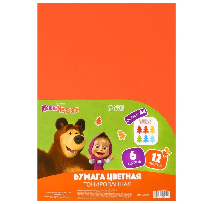 Бумага цветная тонированная, А4, 12 листов, 6 цветов, немелованная, двусторонняя, в пакете, 80 г/м², Маша и Медведь