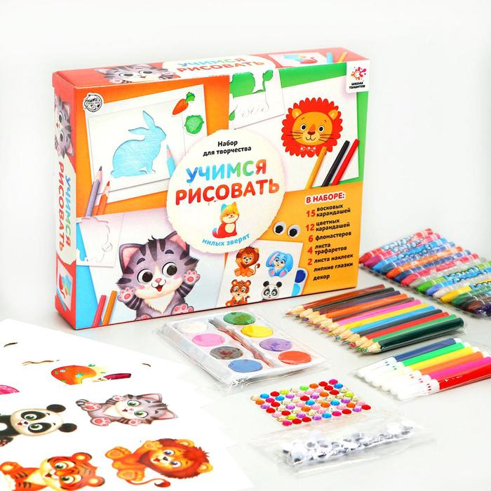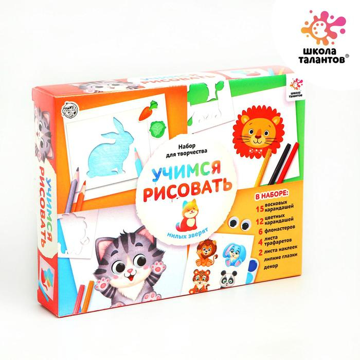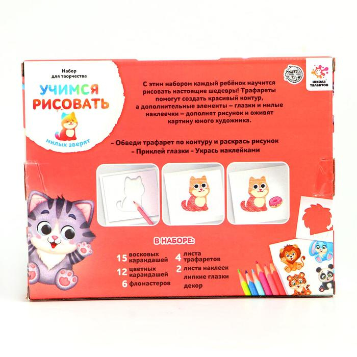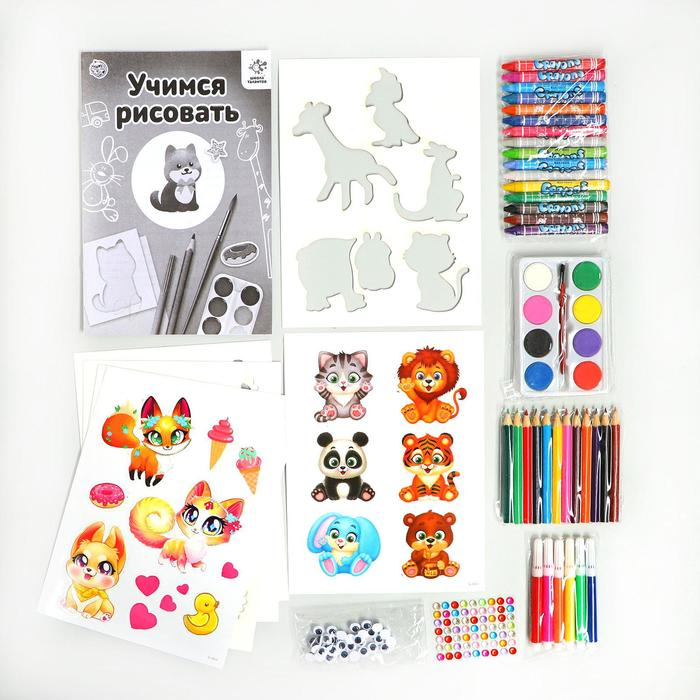 Набор для рисования «Учимся рисовать: зверушки», с карандашами, с трафаретами, с декором, 3+