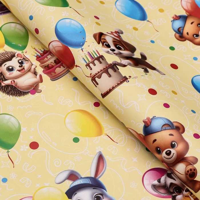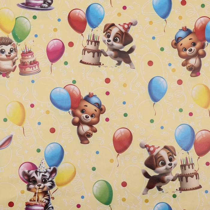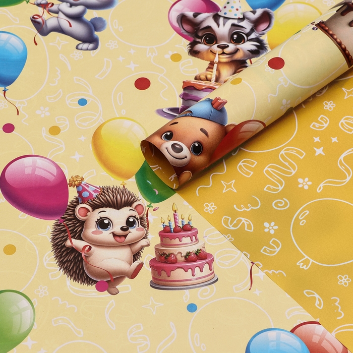 Бумага упаковочная глянцевая двусторонняя "Зверята с шарами", 100 х 70 см