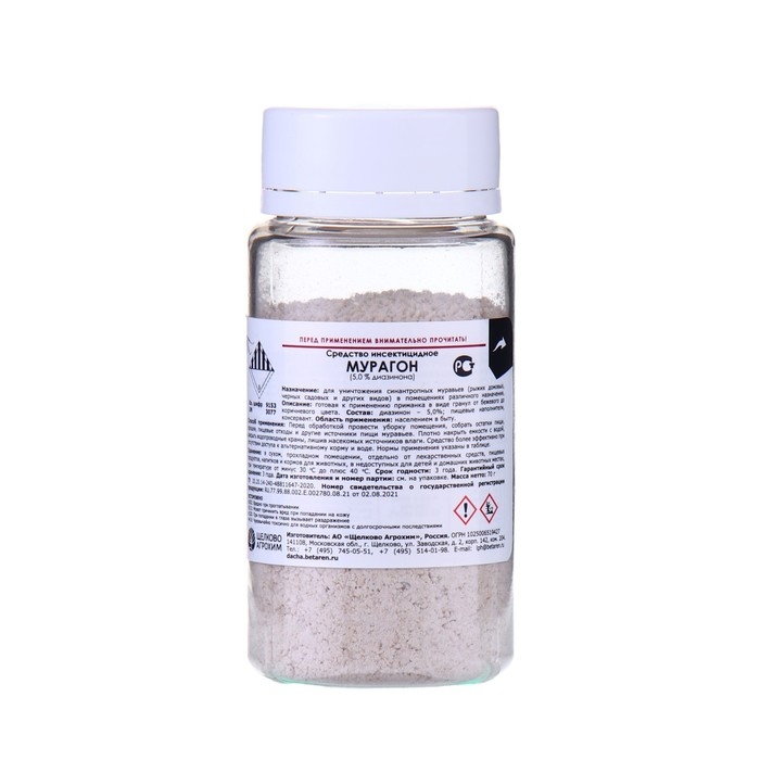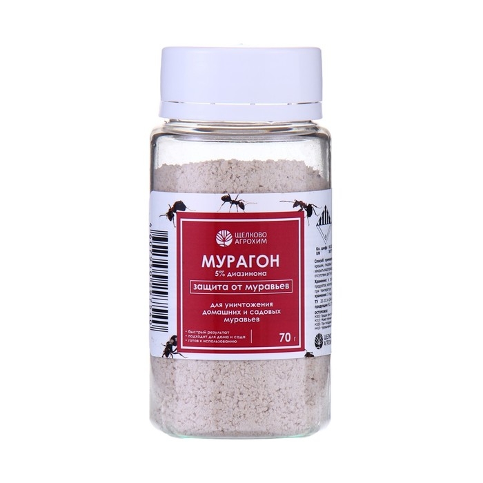 Мурагон – готовая к применению приманка в виде гранул для уничтожения синантропных муравьёв (рыжих домовых, чёрных садовых и других видов) в помещениях различного назначения. Препарат эффективен против широкого спектра вредных муравьёв, проявляет молниеносное действие, обладает слабым фумигантным действием, практически не имеет запаха. Состав: диазинон – 5,0%, пищевые наполнители, консервант.