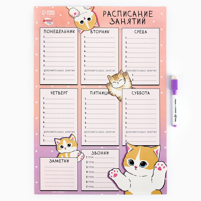Расписание уроков «Милые кошечки» А4, многоразовое магнитное с маркером