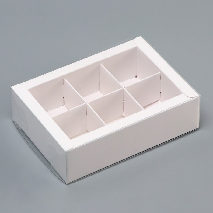 Коробка для 6 конфет размером 13,7 х 9,85 х 3,85 см с прозрачной крышкой — идеальное решение для стильной и эффектной упаковки.