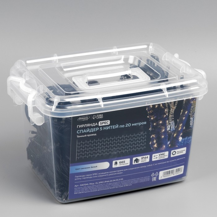 Гирлянда «Клип-лайт» 5 нитей по 20 м, IP44, УМС, тёмная нить, 665 LED, свечение белое, 24 В