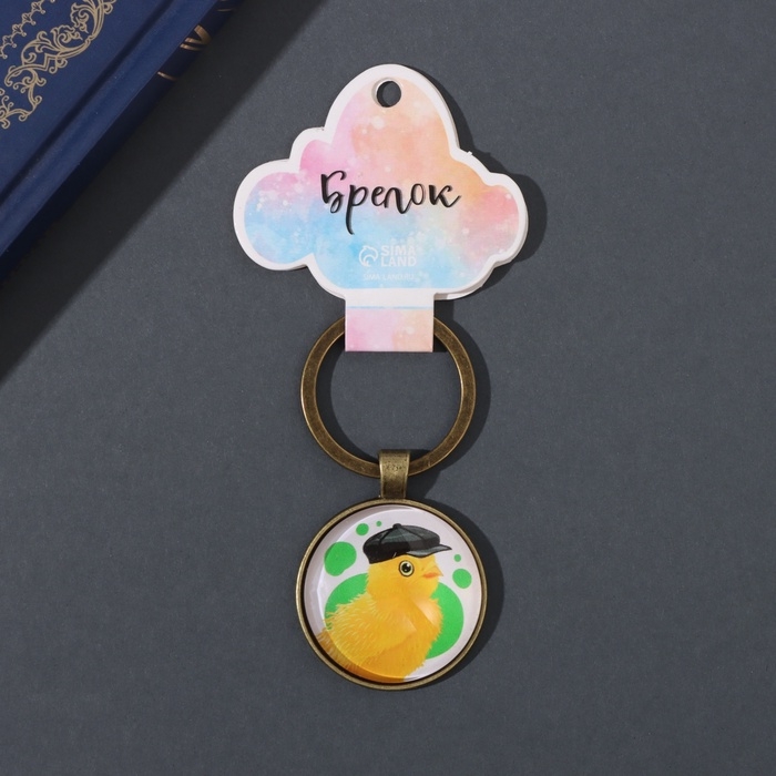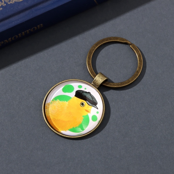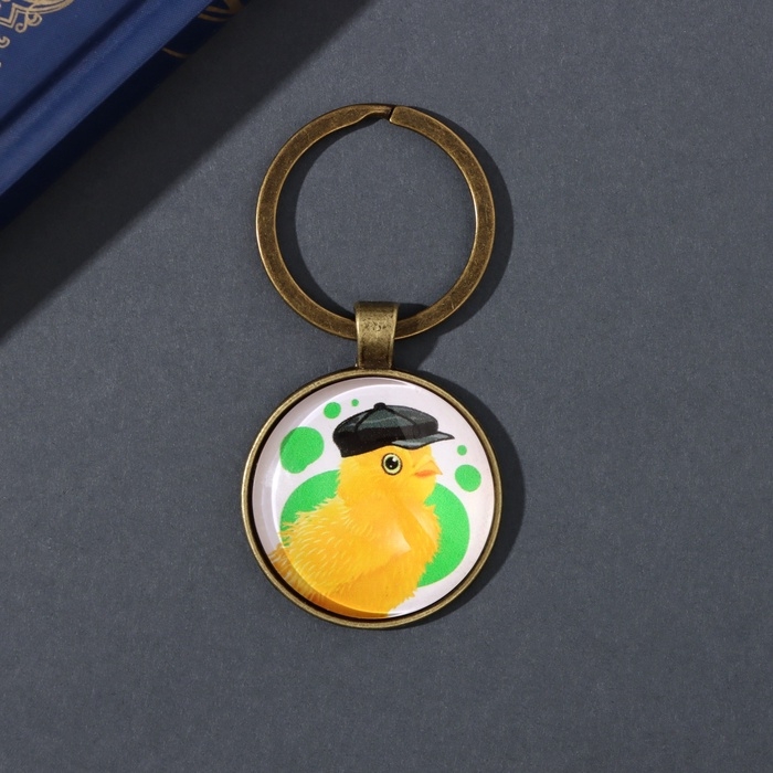 Брелок стекло, металл "Круг. Цыплёнок в кожаной кепке" d=3 см