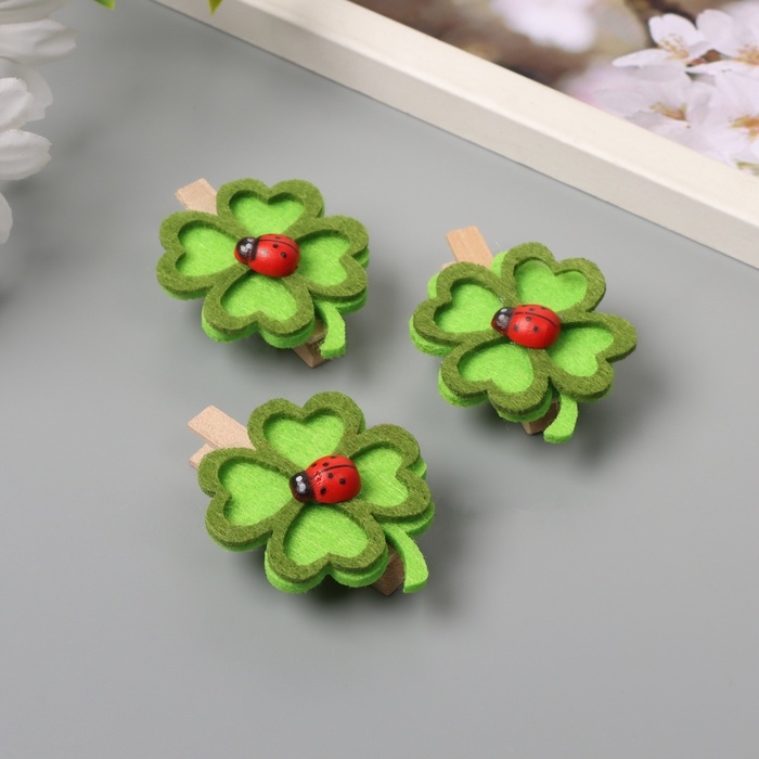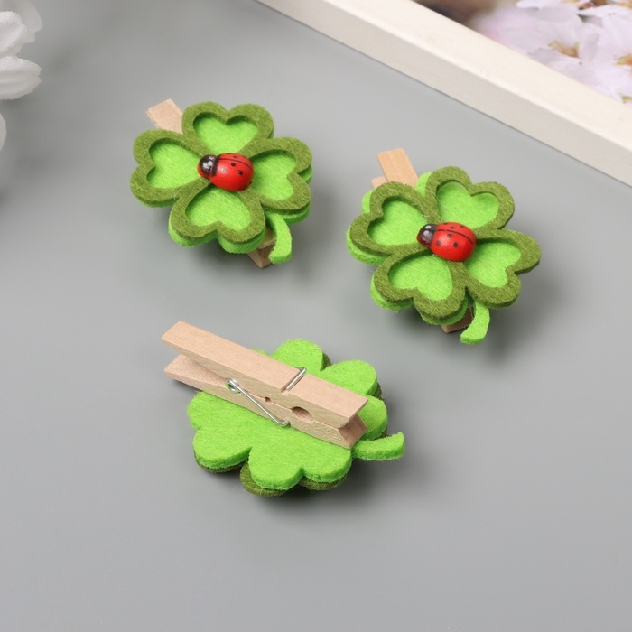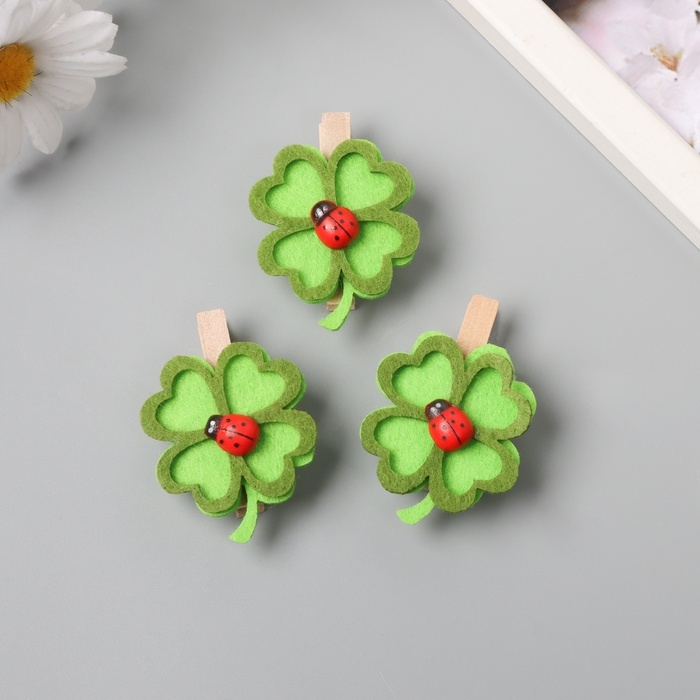 Декор для творчества дерево, фетр "Прищепка. Клевер и божья коровка" н-р 3 шт 1,7х4,6х5,5 см 10473