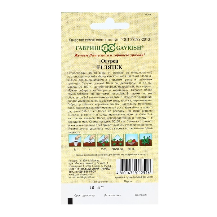 «F1 Зятёк» — это скороспелый партенокарпический гибрид женского типа цветения, у которого период от всходов до плодоношения составляет 45–48 дней. Устойчив к корневым гнилям, настоящей и ложной мучнистой росе. Предназначен для культивирования в открытом грунте и плёночных теплицах. Бугорчатый белошипый негорький зеленец достигает 10–12 см в длину, 3–3,5 см в диаметре и весит 90–100 г. Плод имеет тёмную окраску со светлыми полосами. В пазухе листьев образуется 2–4 завязи, максимум — 6–8. Собирайте на пикули и корнишоны. Используйте огурцы в свежем виде, для засолки и маринования. Посев: на рассаду в конце апреля. Помещайте молодые растения в грунт с конца мая по начало июня в фазе 3–4 настоящих листьев. Производите посев непосредственно в теплицу в середине мая. Схема посадки: 50 × 50 см. Урожайность одного растения составляет 5–7 кг.
