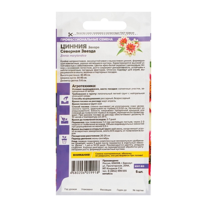 Семена цветов Цинния Захара "Северная звезда",набор 5 шт