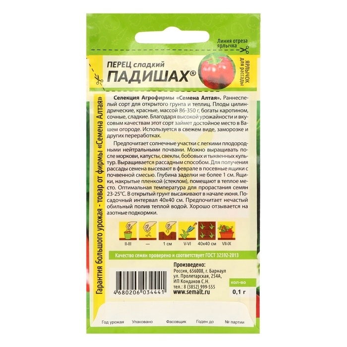 Селекция Агрофирмы «Семена Алтая». Раннеспелый сорт для открытого грунта и теплиц. Плоды цилиндрические, красные, массой 86-350 г, богаты каротином, сочные, сладкие. Благодаря высокой урожайности и вкусовым качествам этот сорт займет достойное место в Вашем огороде. Используется в свежем виде, заморозке и других переработках. Предпочитает солнечные участки с легкими плодородными нейтральными почвами. Можно выращивать после моркови, капусты, свеклы, бобовых (кроме фасоли) и тыквенных культур. Перец нельзя размещать рядом с огурцом. Выращивается рассадным способом. Для получения рассады семена высевают в феврале в посевные ящики с почвенной смесью. Глубина заделки не более 1 см. Ящики, накрытые пленкой (стеклом), помещают в теплое место. Оптимальная температура для прорастания семян 23-25°С. В открытый грунт высаживают в начале июня. Посадочный интервал 40х40 см. Предпочитает нечастый обильный полив теплой водой. Хорошо отзывается на азотные подкормки.