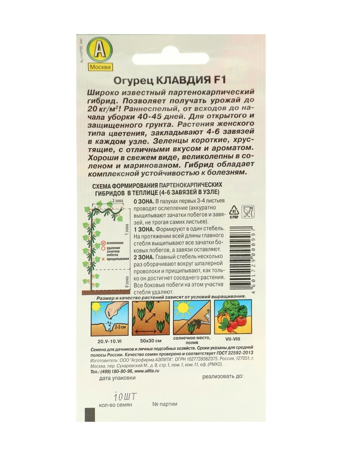 Скороспелый партенокарпический гибрид «Клавдия» образует множество цилиндрических бугорчатых огурцов длиной 10–12 см и массой 65–80 г. Сорт отличается стабильной урожайностью, дружной отдачей и комплексной устойчивостью к болезням. h2>Посев h2>На глубину 1,5–2 см при +25 °С. Затем температуру понижают до 20 ͦС. Семена высевают в грунт в конце мая, когда минует угроза заморозков. Плотность посадки 3–4 растения на 1 м su2 su. h2>Уход h2>Требуются своевременные поливы и подкормки.