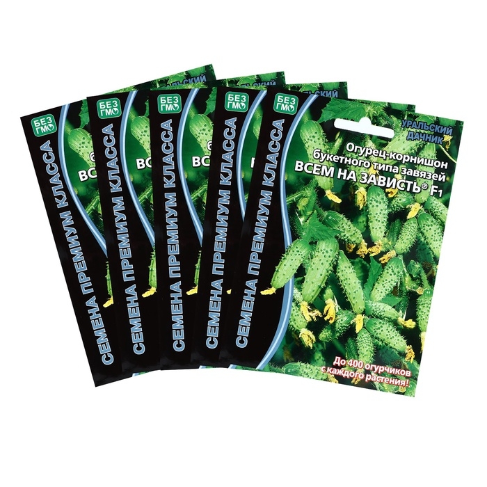 Партенокарпический скороспелый сорт «Всем на зависть» даёт стабильно высокий урожай благодаря устойчивости к болезням и неприхотливости к условиям среды. Хорошее отрастание боковых побегов обеспечивает длительное и активное плодоношение до наступления первых морозов. В узлах формируется 3–6 завязей. Яркие белошипые зеленцы длиной 9–12 см обладают прекрасными засолочными качествами. Большое преимущество гибрида — плодоношение в условиях нехватки света. Это позволяет выращивать огурцы в комнатных условиях. h2>Посев и уход h2>Высаживать нужно редко, не более 2 растений на 1 м². Также требуется обильный полив с подкормкой азотным удобрением.
