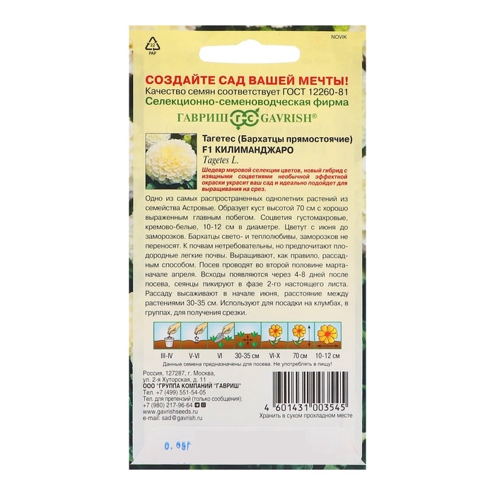 Семена бархатцев «Килиманджаро» помогут воплотить в жизнь ваши идеи по созданию красивой и ухоженной территории. Они подходят для использования в разнообразных ландшафтных композициях, идеально дополняя другие растения.