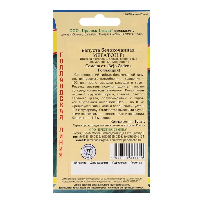 Семена Капусты белокочанной "Мегатон", ц/п, F1, 10 шт.