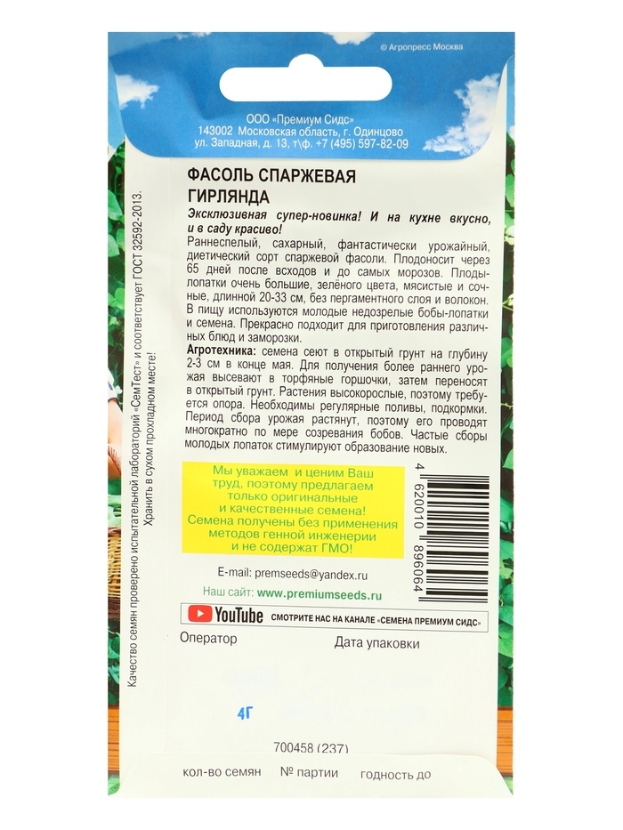 Раннеспелый, сахарный, фантастически урожайный, диетический сорт спаржевой фасоли. Плодоносит через 50-65 дней после всходов и до самых морозов. Плоды-лопатки очень большие, зелёного цвета, мясистые и сочные, длинной 20-33см, без пергаментного слоя и волокон. В пищу используются молодые недозрелые бобы-лопатки и семена. Прекрасно подходит для приготовления различных блюд и заморозки. b>АГРОТЕХНИКА: b> Семена сеют в открытый грунт на глубину 2-3 см в конце мая. Для получения более раннего урожая высевают в торфяные горшочки, затем переносят в открытый грунт. Растения высокорослые, поэтому требуется опора. Необходимы регулярные поливы, подкормки. Период сбора урожая растянут, поэтому его проводят многократно по мере созревания бобов. Частые сборы молодых лопаток стимулируют образование новых.