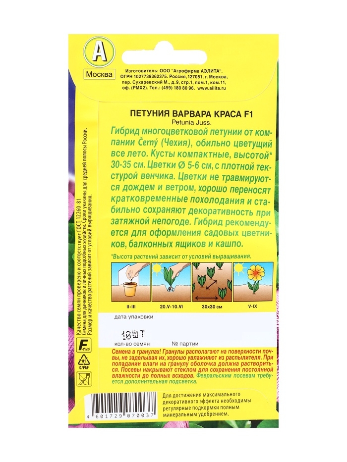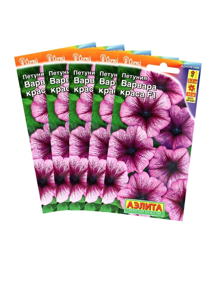 «Варвара Краса» представляет собой улучшенный тип гибридной низкорослой многоцветковой петунии. Растение стало более компактным, а количество цветков увеличилось вдвое. Петуния формирует крупные цветки с яркой звездой в центре. Высота растения — 35 см. Диаметр цветка — 6 см. Посев. Выращивают рассадным способом. Посев поверхностный, без заделки (семена прорастают на свету!), под стекло или плёнку для сохранения постоянной влажности до полных всходов. Гранулы при посеве должны раствориться. Февральским посевам требуется дополнительная подсветка. Всходы появляются на 5–6 день. Сеянцы пикируют в фазе 1–2 настоящих листьев. В грунт закалённую рассаду высаживают в конце мая.