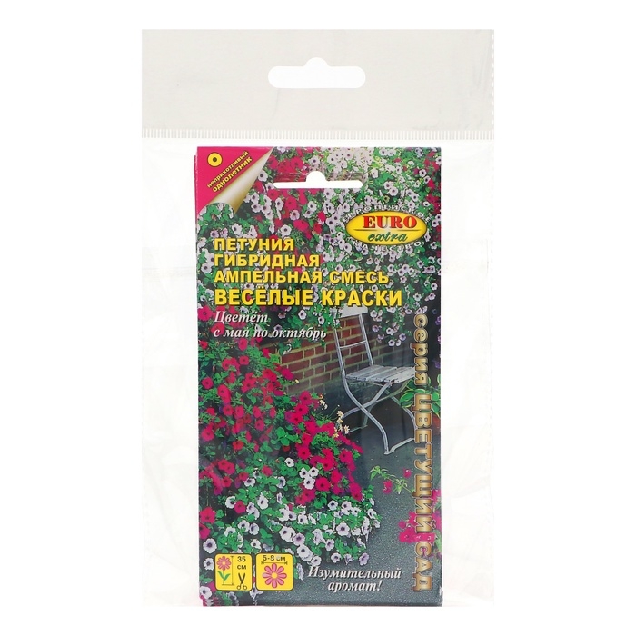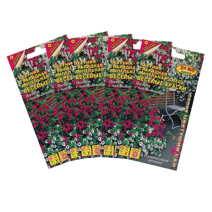 Обильно цветущая неприхотливая петуния, выведенная специально для горшков, вазонов, кашпо и балконных ящиков. Отличается повышенной устойчивостью к неблагоприятным условиям, и длительным (с мая до глубокой осени) обильным цветением. Яркие цветы различных окрасок с необыкновенным изумительным ароматом станут потрясающим украшением Ваших кашпо, ампелей, садовых вазонов, а также балконных и комнатных композиций. Посев: на рассаду февраль-март в подготовленную почву. Затем растения необходимо выдержать при температуре 22-24°С в течение 3-5 дней, после появления всходов температуру необходимо опустить до 18-20°С и поддерживать на таком уровне в течение 25-30 дней. В данный период растения необходимо своевременно поливать, не допуская переувлажнения. В грунт растения высаживаются в апреле-мае после окончания заморозков.