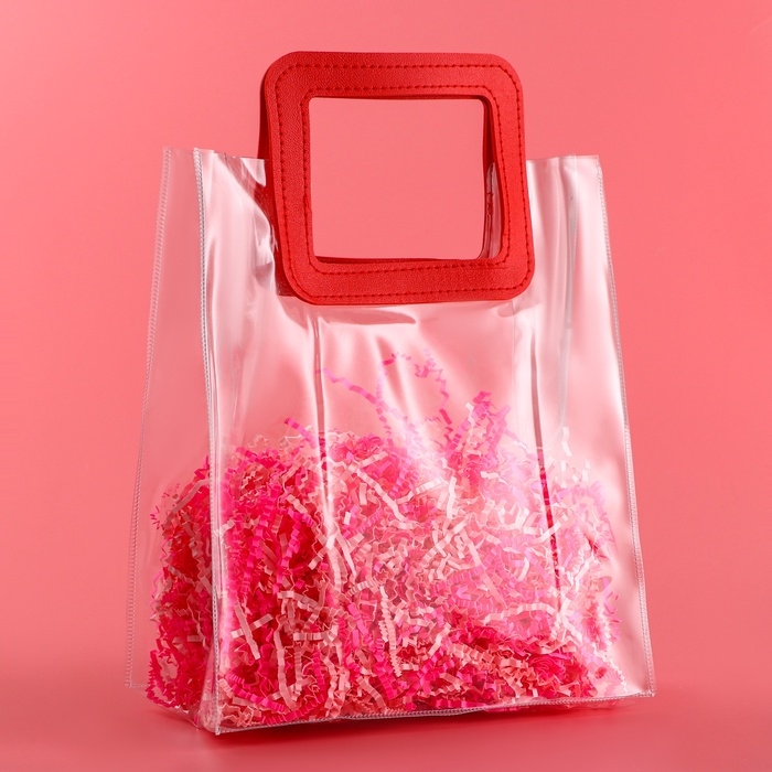 - Прозрачная сумочка с фигурной ручкой идеально подходит для различных видов подарков, начиная от косметики и заканчивая небольшими предметами интерьера.