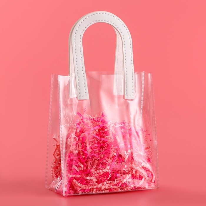 - Прозрачная сумочка с фигурной ручкой идеально подходит для различных видов подарков, начиная от косметики и заканчивая небольшими предметами интерьера.