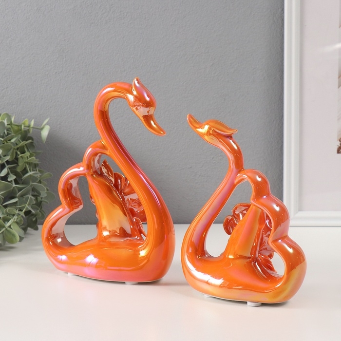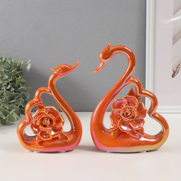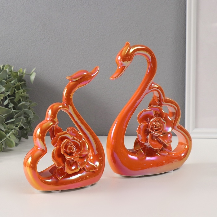 Сувенир керамика "Лебеди с розами" перламутр набор 2 шт h=16,5 см 6х15,5х19,5 см