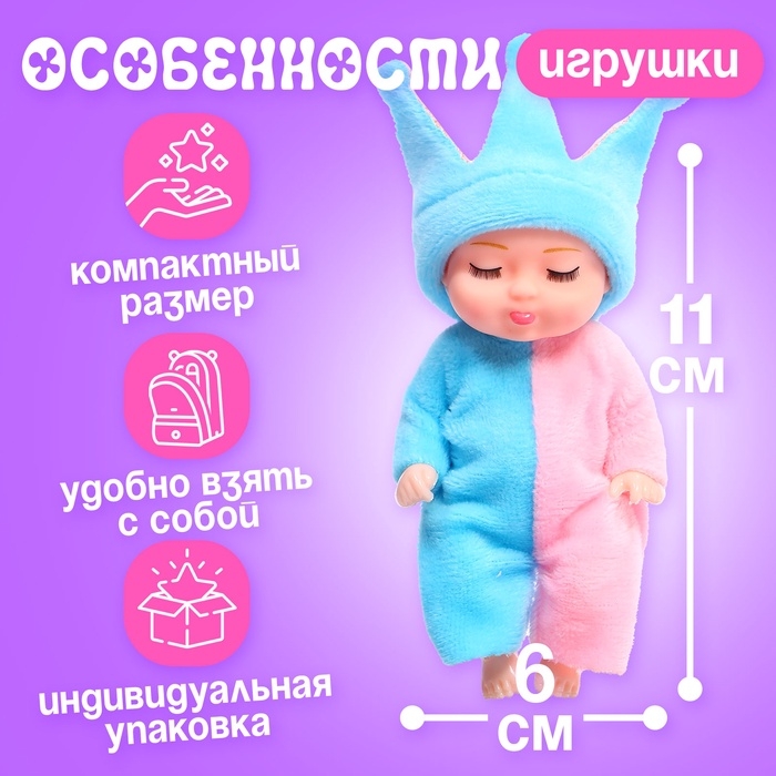 Набор малышей станет отличным выбором для тех, кто хочет подарить ребёнку радость и весёлую игру. В комплекте 6 милых пупсов высотой 11 см, которые идеально подходят для детей от 3 лет. Игрушки выполнены из пластика и текстиля, что делает их приятными на ощупь и безопасными для ребёнка.