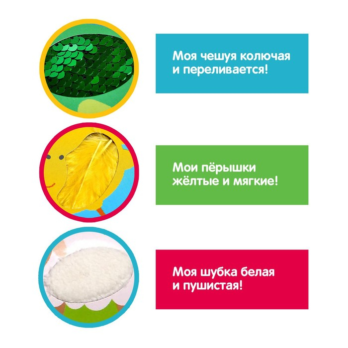 Благодаря тактильным элементам кроха запомнит внешний вид зверей и их названия. Расскажите ребёнку про места обитания животных, их особенности.