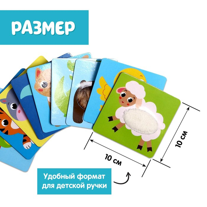 В этой необычной игре есть множество тактильных элементов на карточках с животными. Они представлены вкладками, соответствующими поверхности тела каждого зверька.