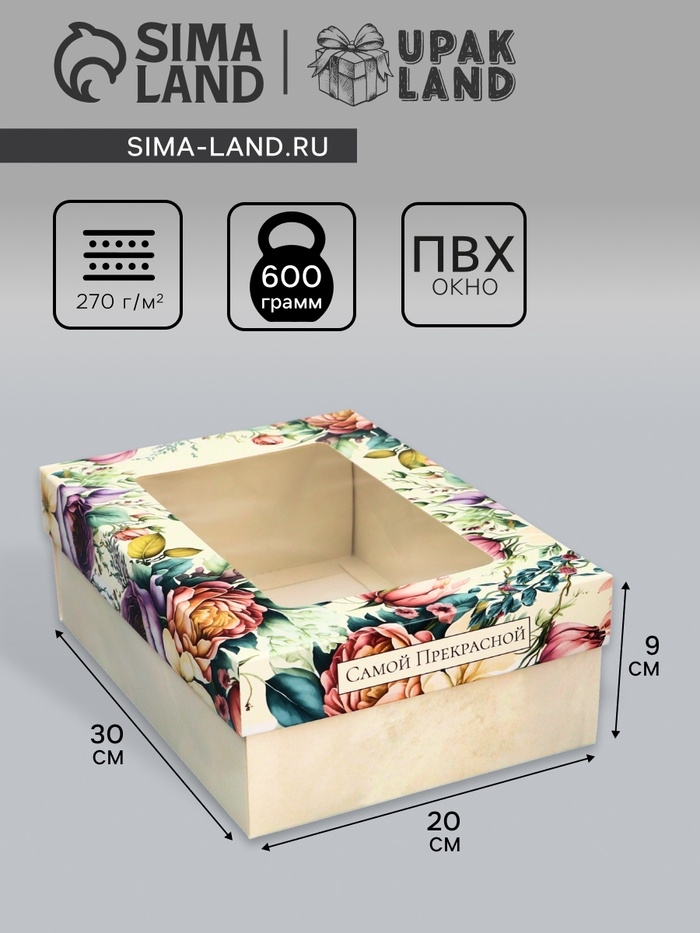 Коробка складная, крышка-дно, "Самой прекрасной", 21 х 15 х 7 см с окном