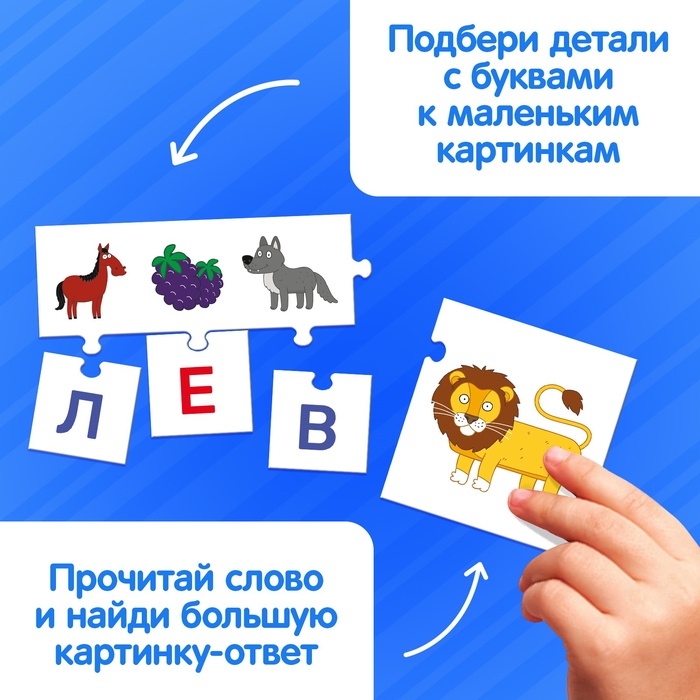 С помощью этого пазла ребёнок развивает мелкую моторику, тренирует зрительную память и учится распознавать буквы и складывать слова. Простая форма и яркие изображения делают обучение увлекательным и доступным даже для самых маленьких.
