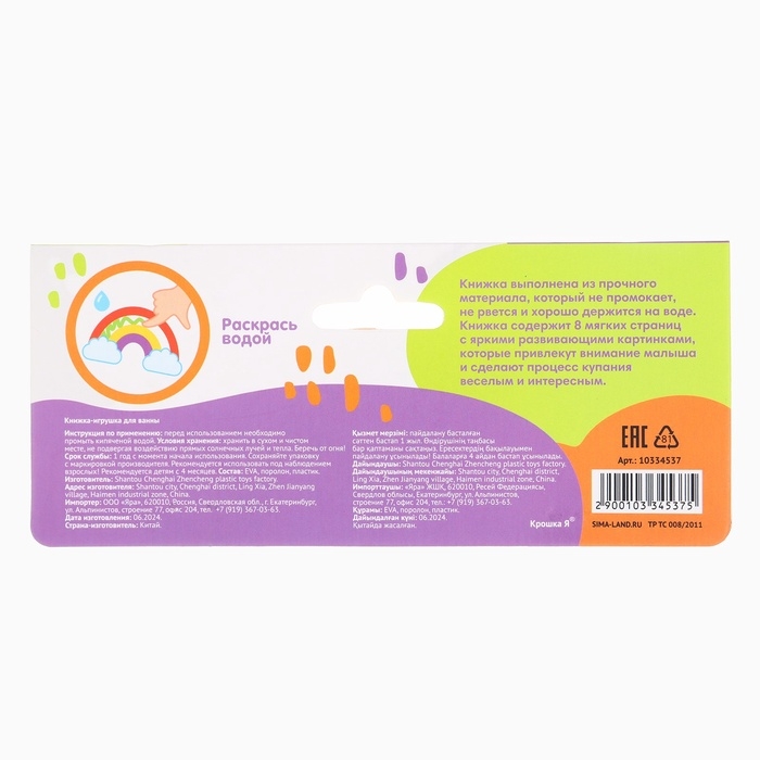 Красивая, яркая книжка предназначена для игры в ванной комнате, малышу будет очень весело разрисовывать книжку пальчиками, от контакта с водой книжка окрашивается разными цветами, после высыхания возвращается в первичное состояние. В книжке малыш сможет познакомиться с веселыми персонажами.