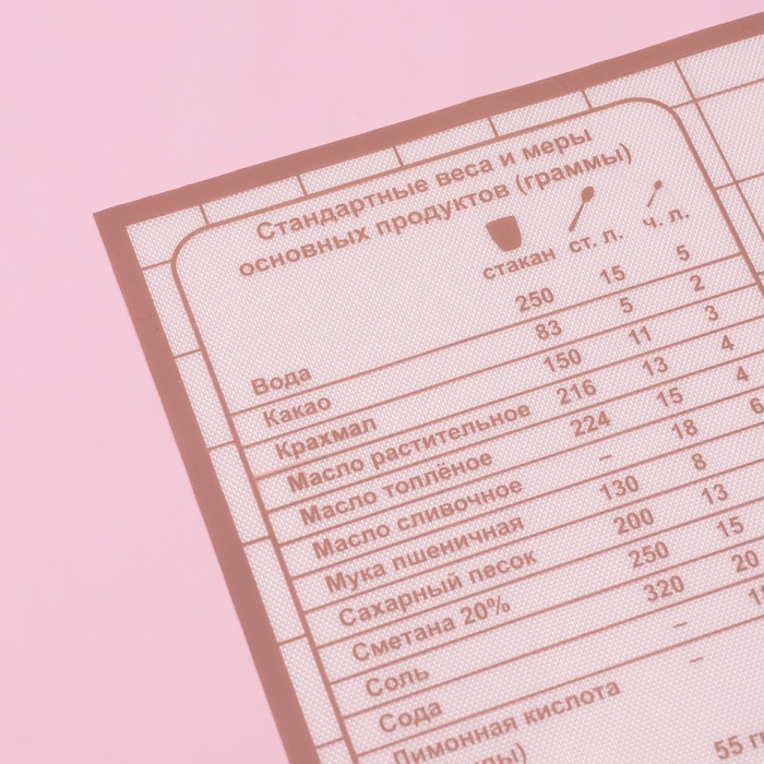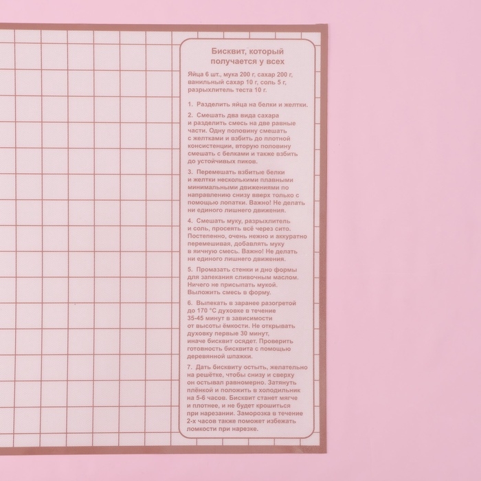 - Встроенный рецепт бисквита: удобный бонус для начинающих кондитеров – на коврике напечатан рецепт бисквита с указанием стандартных весов и мер основных ингредиентов.