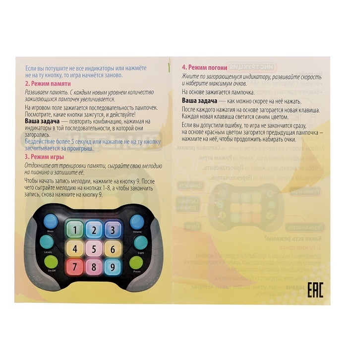 - Режим памяти.Запомните, в каком порядке загорелись лампочки, и повторите последовательность.