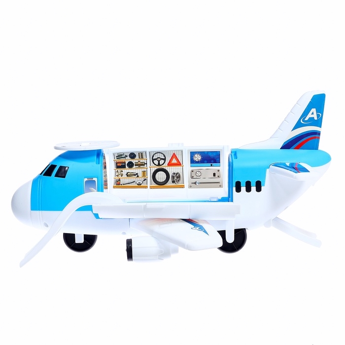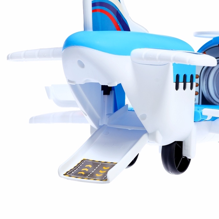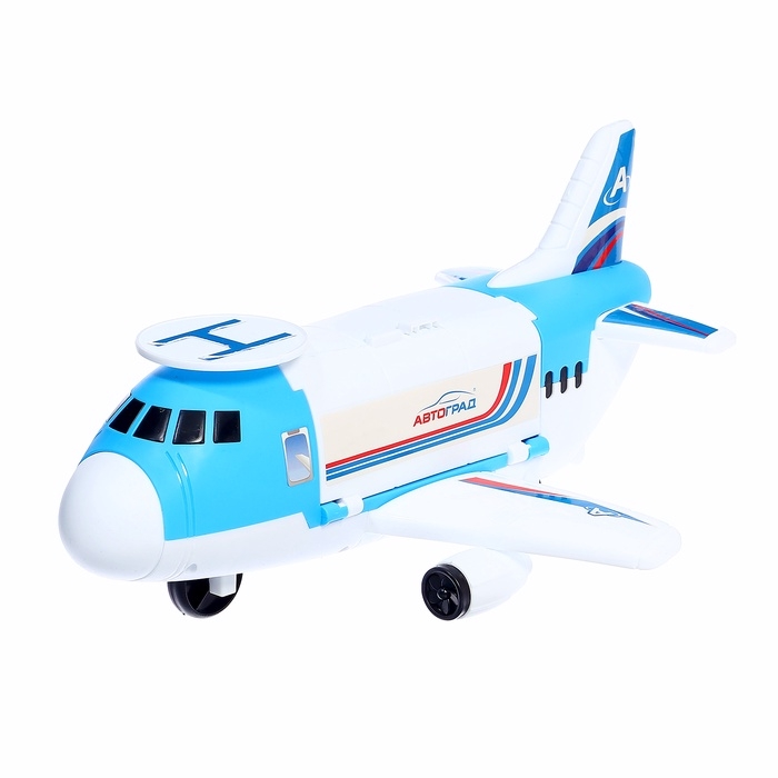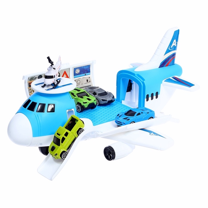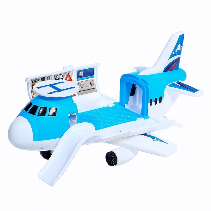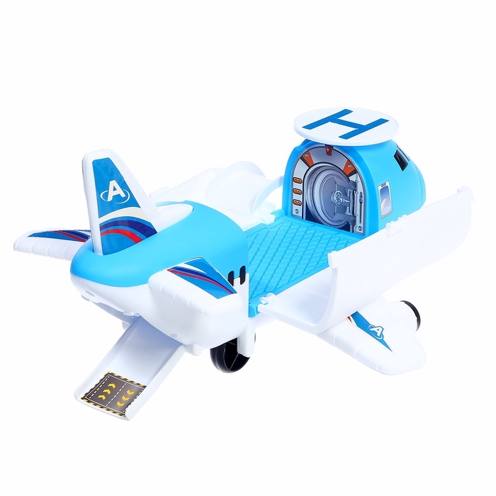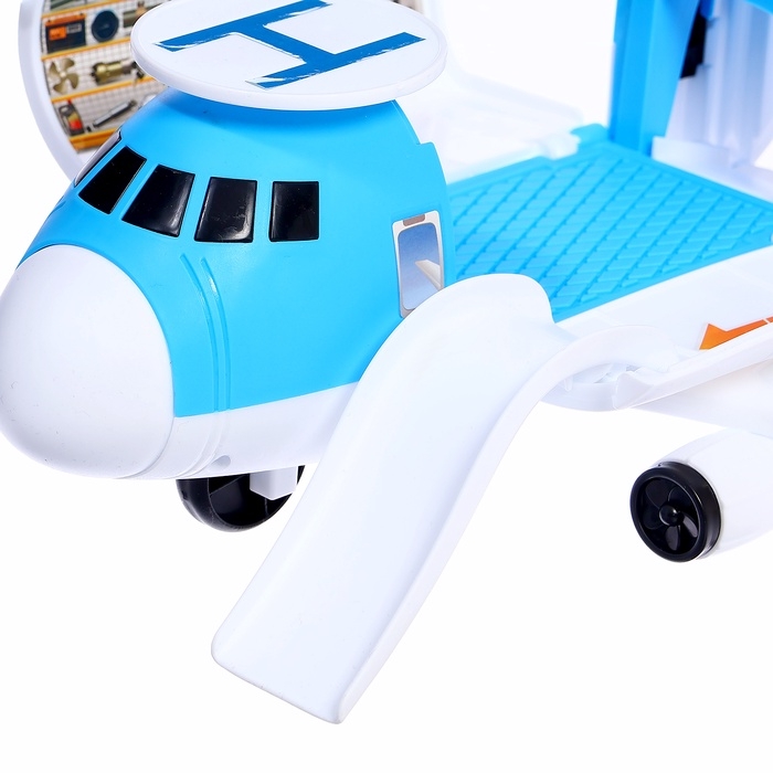 - Самолёт-парковка: яркий и вместительный, он открывается и превращается в игровую зону с гаражом, удобным въездом для машинок, быстрым спуском и вертолётной площадкой.