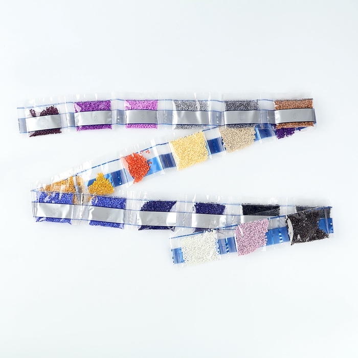 - Из пакетика с номером, который соответствует схеме, отсыпьте в ёмкость немного страз.
