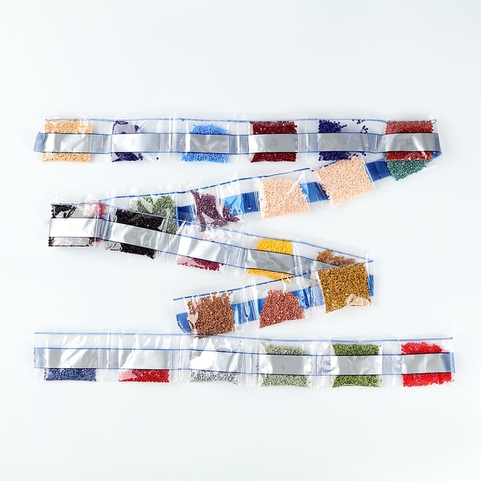 Вам предстоит разложить кристаллики карандашом по пронумерованной схеме. Холст с клеевым покрытием будет надёжно удерживать стразы.