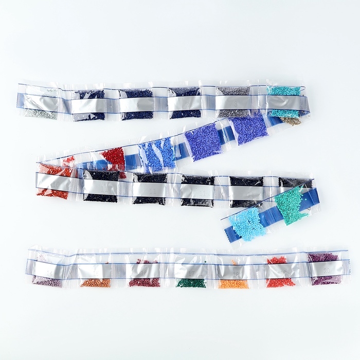 - Из пакетика с номером, который соответствует схеме, отсыпьте в ёмкость немного страз.