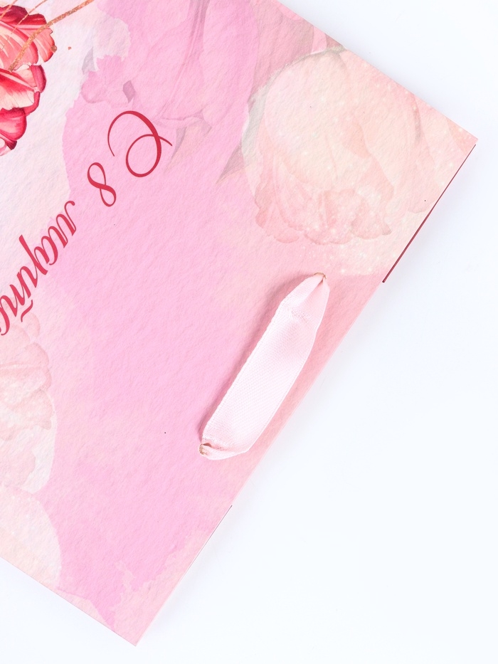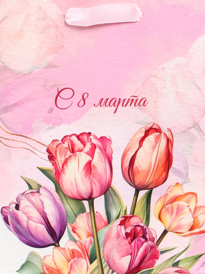 Этот яркий и праздничный подарочный пакет станет идеальным выбором для поздравления девушки на 8 Марта! Вертикальный формат пакета позволяет удобно разместить различные виды подарков, такие как косметика, украшения или книги.