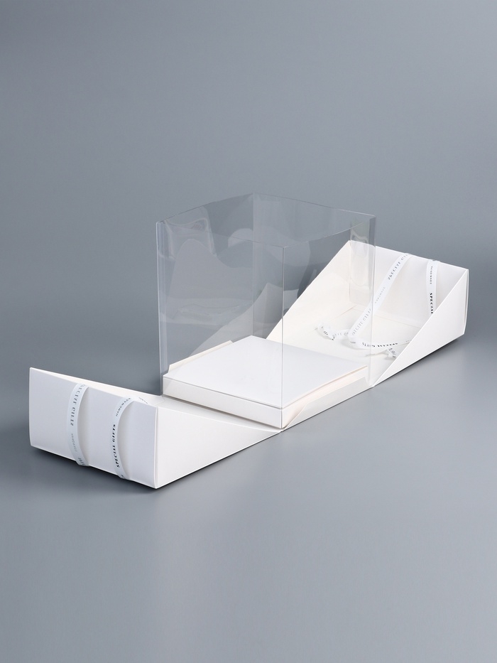 Эта белоснежная коробочка размером 21 х 21 х 25 см выполнена из высококачественного ПВХ-материала, который придает ей гладкость и прочность. Особенностью этой коробки являются ее уникальные картонные боковинки, которые элегантно раскрываются подобно нежным лепесткам цветка.